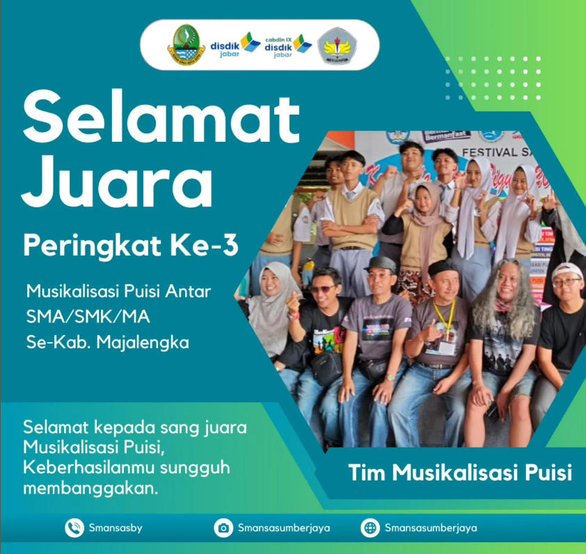 ![]() | JUARA 2 MUSIKALISASI PUISI LOMBA BULAN BAHASA DAN FRASA PIALA SAPARDI UNIVERSITAS SINDANG KASIH MAJALENGKA (2024) TIM MUSIKALISASI PUISI (YUSI, KIRANA,GILANG,ADRIAN,ANGGI,SUPARDI,IKBAL) |