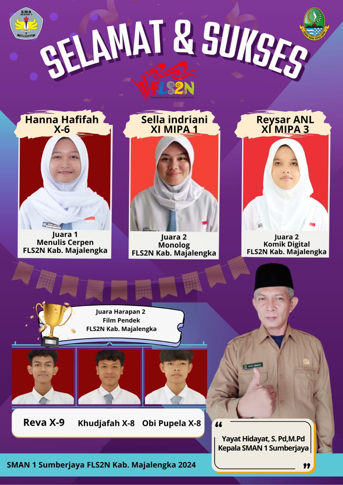 ![]() | Juara FLS2N Tingkat Kab. Majalengka 1. Hanna Hafifah Kelas 10-6 Juara 1 Menulis Cerpen 2. Sella Indriani Kelas 11 MIPA 1 Juara 2 Monolog 3. Reysar Kelas 11 MIPA 3 Juara 2 Komik Digital 4. Reva Kelas 10-9 Juara Harapan 2 Film Pendek 5. Khudjafah Kelas 10-8 Juara Harapan 2 Film Pendek 6. Oby Kelas 10-9 Juara Harapan 2 Film Pendek 7. Nur alif Kelas 10-9 Juara Harapan 3 Desain Poster |